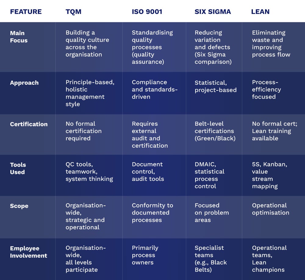 While TQM shares goals with methodologies like ISO 9001, Six Sigma, and Lean, its execution and philosophy differ significantly. Understanding these distinctions helps leaders choose the right approach for specific challenges.
